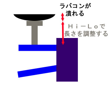 | Hi−Lo KITは、上の写真の赤い矢印の部分がネジになっており、 全体の長さを変更出来る様になっています。 ノーマルの部品は、調整機能がなく、長さを変える事が出来ません。 Hi−Lo KITが何処に付くかというと、下の図のグレーの部分、 ラバコンの下に付く形になります。。 つまり、ラバコンが潰れて高さが低くなり車高が変わってしまうのですが、 Hi−Lo KITで長さを調節し、車高を整えてあげる為の部品なのです。 |