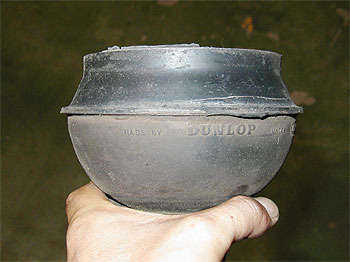 | ミニ、国産(代表的な例)ともに、赤い矢印の様にタイヤが上下します。 ミニの場合は、タイヤが上がるとラバコン(ゴムの塊)が潰れ、衝撃を吸収します。 右の国産車の場合は、タイヤが上がるとバネが縮み、衝撃を吸収します。 何故、この事がHi−Lo KITに関係するかというと、 ラバコンがゴムで出来ているからなのです。 下は、実際のラバコンの写真です。 ラバコンは前後4輪とも同じ物が使われています。 |