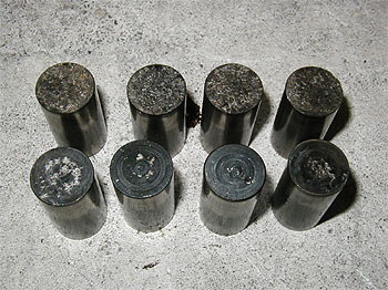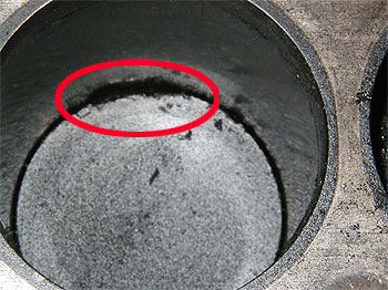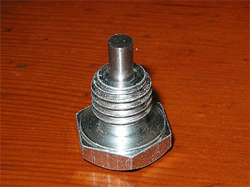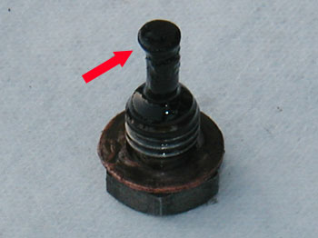| 右の写真は、左側の写真のUPです。 赤丸で囲んである部分、ピストンが欠けているのが解るでしょうか? 当然、ピストンリングも破損しており、マフラーからは白煙を噴いている状態でした。 オイル管理だけが全ての原因ではないですが、エンジンを開けた時にこれだけ差が出るのです。 また、オイルが磨耗を防止しているとはいえ、どうしても多少は磨耗します。 削れた鉄粉はオイルの中へと混じるのです。 その異物の混じった(汚れた)オイルをろ過しているのがオイルフィルターです。 つまり、フィルターの中には、汚れがどんどん溜まっていくのです。 また、フィルターで取れなかったり、下に落ちていく鉄粉もあります。 その鉄粉はドレンボルト(オイル排出口のボルト)が磁石になっており、 そこに吸い付く形になります。 下は、実際に外した時のドレンボルトです。 |