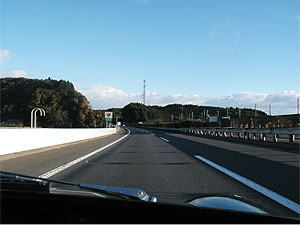 集合は、いつもの通り東北道の佐野SAに6:00。 普段のツーリングと違い(ツーリングは山の方へ行く事が多く、集合場所が自宅から遠い)、自宅から近い私(津久井)は、楽チン。 佐野SAで軽く休憩を取り出発です。 平日とあって、それ程交通量も多くなく走り易い。 皆、良い勢いで走っていくのですが、ギア比の高い私の車は100km/h出すと煩く、90km/h走行。 あっという間に一人ぼっちです。 天気も良く、左の写真のような青空の下、高速を走ります。 |