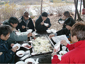 | 午前中の走行が終了し、お昼ゴハン。 今回はバーベキュー! 初めてグランド・スタンド側へ渡り、お待ちかねのバーベキュー・タイムです。 かなり量があり、「こんなに食べて午後は大丈夫?」という感じでした。 |