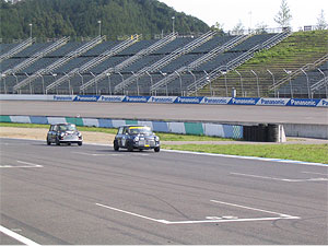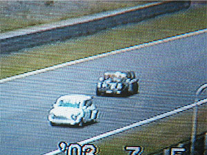 | 無事給油が完了し、8人目のドライバーである塩原と交代。 塩原も順調に周回を重ねて行きます。 59秒、58秒とタイムを縮め、54秒台に。 その後も54〜55秒で周回。 右の写真は写りが悪い(ビデオを撮ったので)ですが、奥のダウンヒル・ストレートです。 ツインリンクで一番スピードがのる場所で、メーター読みで160kmくらい。 そこからブレーキング、シフトダウンをし、右に直角に曲がって行きます。 心の中で「塩さん、がんばれ〜。」と言いながらビデオを回していました。 95LAP目に塩原がピットイン、最終ドライバーでクラブ フラジル会長でもある椎名にバトンタッチ。 |