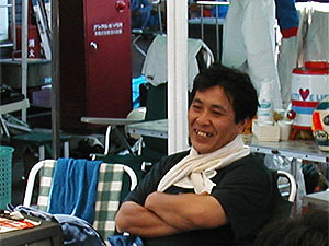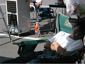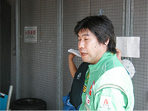 ここから2スティント目に突入です。 椎名から上島に交代。 上島は、ほぼ3分フラットのタイム。 「よく考えたらさぁ、1000の時と一緒のタイムだったよ。」 「車の事を考えてだねぇ、温存だよ、温存。」と本人は言っていました。 120LAP目で上島はピットイン、塚越に交代。 メットを脱いだ顔は疲れ切っていました。 ここで、1つ問題が発生。 タイヤは最後まで交換無しで行けるか?と様子を見ていたのですが、フロントだけ換えて、後半の走りに備えた方が良さそう。 「もし、夕立でもきたら・・・」という不安もありました。 そこで、次のピットインでフロント2本を交換する事に。 |
