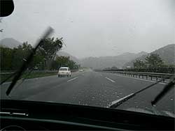 | 今回は、VANもサーキット走行します。 オーナーはちょっと緊張気味。 | 高速上は雨。 早く天候が回復してくれる事を祈りながら走ります。 |