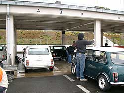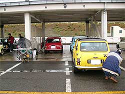 | 当日の参加車輌はミニ屋より23台26人、別ショップから6台の合計29台です。 那須サーキット恒例となっている東北自動車道の佐野SAに朝6:00に集合します。 この時点は天候は雨。 超大型の台風23号は、前日のうちに抜けたのですが、まだ天候は回復していません。 今回初参加の方が10台(11人)おり、雨の中の走行が心配です。 簡単に挨拶を済ませ、一路那須ICを目指して出発です。 |