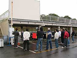 | 1時間ちょっとでサーキットへ到着。 この時点でも小雨が降ったり止んだりという状態。 路面は完全にウェットです。 雨のサーキット走行は、低い速度でタイヤが滑るので練習にはなるのですが、やっぱり怖いですね。 初参加以外の参加者でも、雨のサーキット走行経験があるのは数人だけ。 やはり皆緊張しているようです。 車輌にテーピング等の準備をし、ドライバーズ・ミーティングを行います。 |