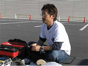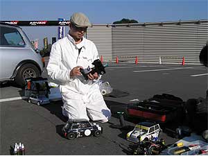 | 午後の部が始まる前に、ちょっとした遊びを。 ミニ屋ラジコン部(と、言えるのか疑問)が、ラジコンで勝負? 各自、自慢のマシンを走らせます。 これがFFの特性を良く出しており、面白いんですよね。 |
