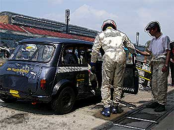 指定されたグリッドに着いたフラジル号ですが、あれ?後ろを見るとミニは少ししかいません。 まずミニ52台が走るはずなのですが・・。 今年のスタートは52台中45番手から。 抽選を行った芹澤も「俺のクジ運も終わった・・。 来年は誰かに任せる」とガックリ。 でも、誰も恨んではいませんよ。 自分が引いてもっと悪い可能性もある訳ですから。 ここから頑張って追い上げましょう。 何しろ12時間もあるのですから。 |