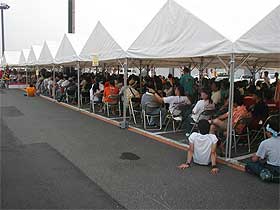 | AM5:30ゲートオープン予定でしたが、ゲート前に並ぶ車輌が予想より多く、少し時間を早めてのゲートオープンとなりました。 まずは、ここから戦いが始まります。 今回は参加総台数125台!という台数の為に、1ピット当たり8〜9チームの割り当てとなっています。 車輌の搬入はもちろん、自分達のくつろぎ?スペースとなるテントを設置する場所を確保しないといけません。 猛ダッシュで場所取り、荷物、レーシングカーの搬入と慌しくこなし、車検に備えます。 |