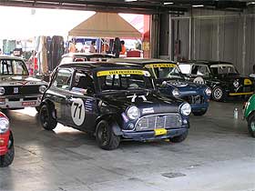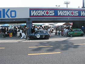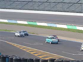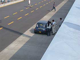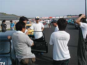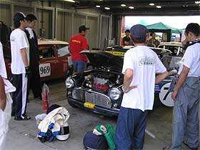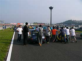 時計はAM7:00を回り、スタートまで約1時間。 いよいよ車輌をコース上に運び入れます。 この12時間耐久は、ミニを初め3つのクラスで編成されており、ミニ以外にも国産車やポルシェ、BMWなど色々な車種が混走で優勝を争います。 ミニは総台数52台。 スターティンググリッドは抽選によって決定するのですが、抽選は毎回良いポジションを引き当てる芹澤(以下、ドライバー・ピットクルーは敬称略)が引く事となっています。 4月のミニディでは塚越が引き、35台中33番手というポジションでしたので、「今回は良いポジションを・・」と期待。 |