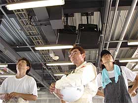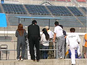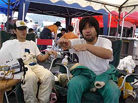 | さて、その頃ピットレーンではヤグラ及びモニターを設置中。 毎周ごとにサインボードを出すピットエリアは日差しを遮る物が無く、非常に暑くツライ。 レースを走るドライバーよりもピットクルーの方が過酷であると言えるでしょう。 2003年は暑い日差しの中、とてもツライ思いをしたのですが、今年は一味違います。 それが写真のヤグラ。 日差しを遮り、モニターや資料が置け、尚且つイスが収納出来ると言う優れものと作成者(右の写真)である本人談。 「こいつはイイぜ」と張り切って設置をしたら、微妙に屋根が小さく日陰が出来ず、モニターを置く台は高すぎるのでイスにモニターを置き使用する事となりました。 優れものかどうかは別として、仕事の忙しい中作成して、出発の日の夜、仕事が終わった後に届けてくれた星野君、ありがとう。 とっても?役に立ちました。 今年は仕事が忙しく、ピットクルーとして参加して貰えませんでしたが、次回はよろしく! |