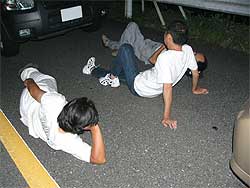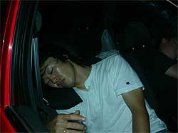 | レース前日の金曜日は、通常通り仕事をこなしPM11:00にミニ屋に集合。 各ドライバー、ピットクルーを含め13人という12時間を戦うには少数精鋭チームが勢ぞろい。 レーシングカー、予備パーツ、テント等の荷物を積み込み、各車輌に分かれて一路ツインリンクを目指します。 日付が変り30日(土)AM2:00頃ツインリンクに到着。 ゲートオープンまで時間があるので寝ようと思うのですが、思ったより暑く、また興奮しているのか寝付けません。 上の写真はAM3:30頃。 あまりの暑さに私が外に出ると、何名かが続いて外へ。 「ここで寝た方が良くない?」なんてバカ話しをしている時。 しかし、今回がレース初参戦となる野口は車内でグッスリ。 図太いのか、ニブイのか、フラッシュ焚いても微動だにしませんでした。 |