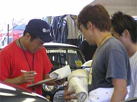 こちらは、車検中の1コマ。 赤いTシャツを着ているのが検査官です。 車輌そのものには問題も無く、無事車検にパス。 ところが、ここで問題が発生! 耐久レースでは、途中でガソリンの給油が発生するのですが、その給油作業についてのルールが変更となっていた。 2003年では、耐火スーツ(レーシングスーツ)にヘルメットでOKだったのですが、今年はヘルメットではダメで、耐火のマスクをしなければならないとの事。 給油時に最低3個のマスクが必要になるのですが、私たちは2つしかない。 「他のチームから借りるか、売店が開いたら買ってきて下さい。」との指示。 マスクがないとスタンド給油(サーキット内のガソリンスタンドで給油)となってしまう為にロスタイムが大きい。 給油までの時間でマスクを何とかしなければ・・・。 |