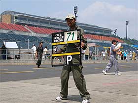 | 上島からチェンジした塩原がコースへ向かいます。 ここで、ちょっとピットクルーも紹介。 まず、サインボードを持ち、ピットへ入ってくる車輌を待ち受けている石原。 イベントやレースの応援ではちょくちょく登場しているのですが、ピットクルーとしては初参戦。 真夏の暑い中、12時間体力が持つのか心配? まだこの時点では、動きも軽いです。 右はピットアウトしていく塩原。 マシンの調子は如何に? |