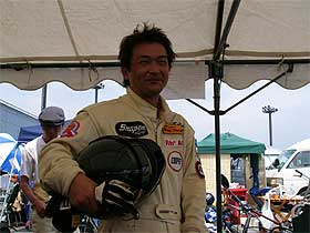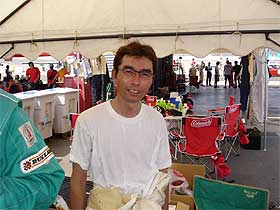 | 2003年は、口数が少なくなる(塚越としては、一大事なぐらい珍しい)ほど緊張していた塚越も、ミニディ、そして12時間と3回目のレースとなると大分余裕なようです。 始めは3分ちょいで走っていた物の、少しずつタイムを上げ、2分55秒前後でラップを重ねていきます。 その頃、テントに戻ってきた芹澤はご覧の笑顔。 「やっぱりレースは楽しいね〜。」と。 |