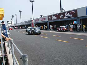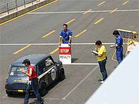 さて、塚越が順調に・・・って、あれ? ピットロード出口で止まっているのは、フラジル号じゃありませんか! 2分54秒というベストを出して走行していた塚越ですが、ピットクルーの元へオフィシャルが。 手にはペナルティの用紙を持っており、「黄旗(追い越し禁止)追い越しにより、2分間のペネルティです。」との事。 急遽、ピットからピットインのサイン。 「あれ? 時間調整で予定周回が少なくなったのか?」と思いつつ、塚越がピットイン。 そこで初めてペナルティだと知らされ、ピットロードの出口で2分間のストップ。 塚越は納得いかず、オフィシャルに「何でペナルティ?」 と聞くと、「セーフティカーの際の黄旗追い越しです。」との事緒。 塚越は、「俺、セーフティーカーの時は走ってないよ!」と言うと、「貴方か、貴方の前のドライバーかは解りません。 どちらにしろ、黄旗追い越しです。」と。 更に、新たな事実が判明! オフィシャルより「黄旗追い越しで2分ストップだが、黒旗(ゼッケンを表示された車輌はピットに入らなければいけない)無視で、更に10分のペナルティです。 1周回って、もう一度入ってきてください。」 塚越も「えっ? 俺に黒旗は出てないよ。 番号も確認していたよ!」と伝えますが、「どちらにしろ、前のドライバーかは解りませんが、10分のペナルティです。」 仕方なく、2分停車後コースインし、再度10分のペナルティです。 |