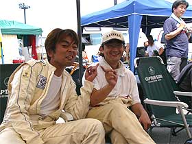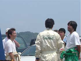 | 花田の走行を見守るメンバー。 監督?である上島を中心に作戦会議中。(と言うほどの作戦があったかは不明) 次に走る野口はレース初参戦&ツインリンク初走行にもかかわらず余裕の表情。 これから走るという緊張感の欠けらもありません。 やはりニブイのか? |