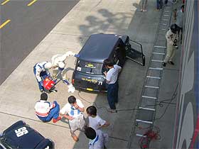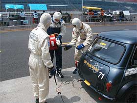 | 塩原は2分59秒のベストを出し、14周/48分走行後ピットイン。 ここで1回目の給油です。 マスクを何とか調達し、無事ピット給油が行なえる事に。 給油中は、ドライバー降車と給油以外の作業は出来ず、給油が終了しても5分間は作業が出来ません。 ノンビリと作業を行っても2分程で終わってしまう為、「F−1の給油のように・・・。」というような事も無く、あせらず確実にこなしていきます。 20リッター給油し(一度の給油は20リッターまで)、規定タイムが終了するまで待ち。 走り終えた塩原は、普段はあまり汗をかかないのですが、流石に汗びっしょり。 「マシンの調子は大丈夫。 白煙も出ない。」という事で一安心。 しかし、「早い車(ポルシェなどの直線が早い車)との速度差が大きく、台数も多いから怖い。」との事。 自分の番までに、少しでも車が減る事を祈ります・・。 |