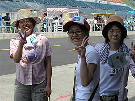 | コースインした花田は、直ぐに2分54秒をたたき出し、更に51秒、そして49秒というタイムを出してきます。 多少、体制が落ち着き、クリアもとり易くなって来たのも幸いし、54秒前後のタイムで周回。 何度か最終コーナーで外に膨らみ、砂煙を巻き上げていく姿にドキッとする場面もありましたが流石です。 その頃、ピットでは応援3人娘!が。 Yさん母子とFさんです。 首に巻いたタオルは、農家のオバちゃんだよFさん・・・。 |