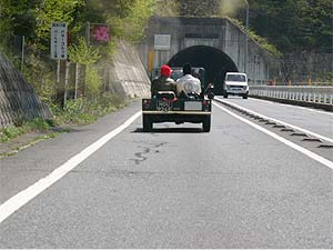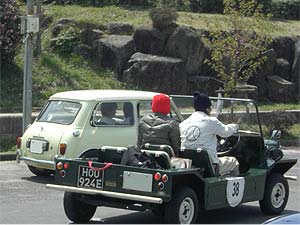 | その頃、津久井・塚越組は第2CPを目指し爆走?中。 途中からミニ・モークの後ろを走る事に。 モークはやっぱりロールバーの無いミニ・モークがカワイイ。 「コーナーで2人揃って傾くのがイイよね」と話しながら追走。 |
