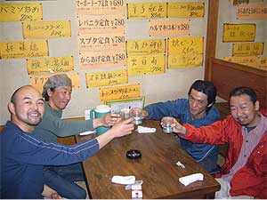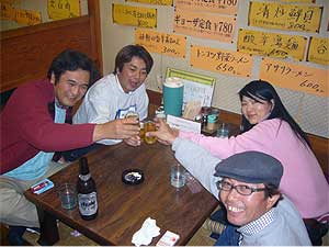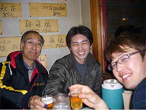 | 岡崎では、美味しいウナギを食べたかったのですが、時間的に断念。 近くをうろつきますが、あまり食事をする所が無い。 最終的に中華料理屋に落ち着きました。 明日から始まるイベントの無事を祈り乾杯。 ちなみに撮影者(津久井)は移ってません。 残念。 後はホテルに戻り、ちょっとだけ酒盛り。 翌日に備え、早めの就寝です。 |