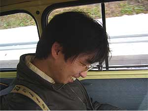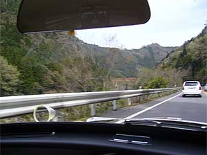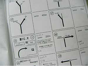 | ここで毎年紹介している地図について。 クラシック・マラソンはタイムラリー形式のイベントになっており、スタートからゴールまでコマ地図の支持にしたがい、指定時間に近く到着するという競技。 スタートで渡される地図は写真の様な物で、次の交差点までの距離と、目印しか記されていません。 この地図を頼りにゴールを目指すのですが、助手席のコ・ドライバー(以下コ・ドラ)は距離計算をする電卓(マイルメーターはキロメートルに換算しないといけません)、そして地図とニラメッコになります。 ドライバーは指示通り走るだけなので、ある意味気楽ですね。 右の写真は、高速走行中に距離計算を行うコ・ドラ入江。 昨年に続き、運転中の津久井が撮影しているのは内緒です。 津久井/入江組はアクセル全開、先行する塩原/塩原組を追いかけます。 |