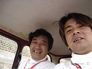 | いよいよ塩原/塩原組がスタートゲートに向かいます。 塩原の笑顔は、この先の行く末を暗示しているのでしょうか? 8時18分、6台の先頭を切って塩原/塩原組のスタートです。 |