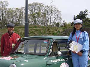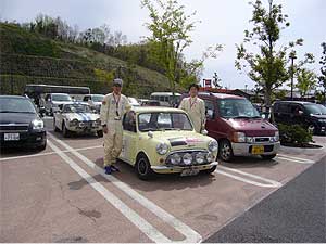 | その頃、先行した2台はというと・・、津久井/入江組は、第1ステージの高速道路を走行中。 「絶対、塩原に追いつくゼ」とアクセルを踏み込む津久井。 初参加ながら冷静な入江を横目に、更にアクセルを踏み込みます。 「あっ、あれは塩原か?」と追い上げると、全然違う車輌。 ガンガン走るのはいいが、実はスタートでペーパーTESTを渡されており、第1チェックポイント(以下、CP)までに回答しないといけない事を思い出す。 しかも、このテストが微妙に毎回難しいんです。 ミニ関係の問題は何とか解るにしても、全然検討も付かない問題も・・。 絶妙にイヤ〜な所を突いてきます。 慌ててテストに回答を書き込み、予定のCP手前PAで時間調整。 その後、CPを目指し再スタートを切るが、予定の距離まで走ってもCPが出てこない。 「あれっ? 見落としてないよね?」と車内で2人は不安になる。 しかし、「多分、地図の間違いでしょう」という事で、更に進む事10km、やっと第1CPに到着。 ここで塩原/塩原組に追いつきます。 テストを提出し、記念撮影。 しばし2組で休憩、そして再スタート。 |