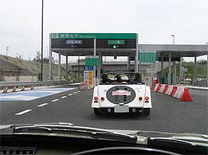 | 後方では、石原/奥野組が高速を降りるところ。 モーガンに続き料金所へ。 ちなみに、写真には無いですが、西薗/小林組のライレー、秘密兵器?の1つETC装備で料金所は快適通過。 |