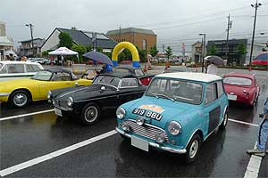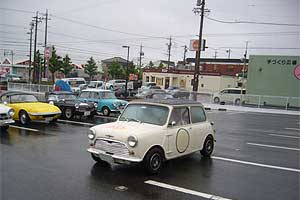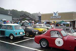 | ゼッケン1は1935年製ラゴンダ、そしてゼッケン2は1936年製オースチン・セブン。 この2台から比べたらたかが50年弱で屋根の付いているミニは快適!と言われてもしかたありませんね。 いつもはスタートでは1台ずつ紹介して1分おきに出るのですが、雨のためナダレ式にスタート! 各自時間はCP(チェックポイント)手前で調整という事になりそうです。 |