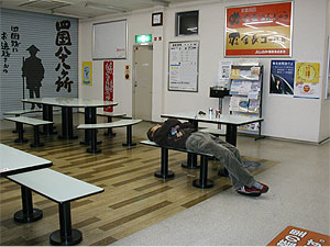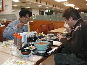 写真はラーメンを食べる塚越とソースカツ丼を食べる塩原。 塚越は長時間用メガネ姿です。 このソースカツ丼は、あまりにもソースがしょっぱく、ソースの味しかしなかったそうです。 早々と食事を済ませ、SAを後に。 まだまだ先は長い道のりです。 |