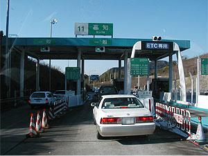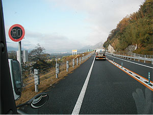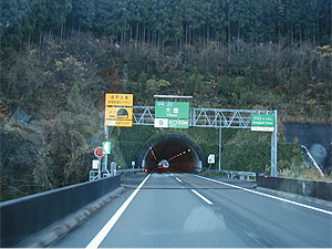 | 空も明るくなり、仮眠を取って元気を取り戻し、高速を走ります。 徳島道から高知道に入り高知を目指していくのですが、高速道路が狭い。 路肩もあまり無く対面通行なので、大型車とすれ違うときはちょっとドキドキ。 左下の写真は高知道ですが、「高知までトンネル19箇所」の看板があり、トンネルの多さにもビックリ。 そして午前9:30に高知ICに到着。 ここまで来れば陸事は目の前です。 | ||