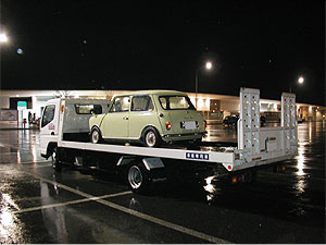| 出発の24日(月)は生憎の天気。 午後には雨も降り出し、折角キレイに仕上げた車が濡れてしまい残念。 キャリアカーに積み込み、塩原、塩原”み”、塚越の3名で夕方18:00前に出発です。 私(津久井)と野口は、今回は留守番。 3人を送り出し、ホッとしているとイキナリ塚越から電話が。 「デジカメ忘れたから持って来て〜」 ホームページ用に写真は沢山撮って来てねと、あれほど頼んでおいたのに・・・。 近くのガソリン・スタンドまでデジカメを持って行きました。 一行は、北関東道・駒形ICより高速へ。 そのまま高崎JCTで関越道に入り、藤岡JCTで上信越道へ。 途中、休憩しながら走り、長野道へ入る。 21:00頃、長野道・駒ケ岳SAで夕食です。 |