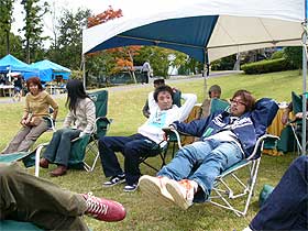 | イスを出し、心地よい日差しを浴びてノンビリ。 | 「一番カッコいいポーズをして下さい。」と頼んで撮った写真。 Oさん的には、決めているようです。 |
