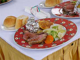 | 色々と車を見て回り、のんびりとした時間を過ごしていると昼食タイムとなりました。 昼食はイギリスらしいメニューです。 SUNDAY LUNCHを皆で楽しみます。 |