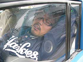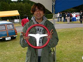 | 賞品片手に戻ってくるHさん。 | 満面の笑みでステアリングを握る塚越。 ドライバーだった私にくれないの? |
