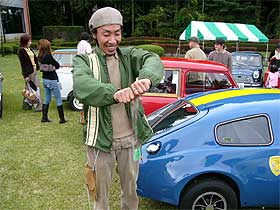 | 6台揃ったところで受付をし、会場入りです。 会場では芝生の上にミニを整列させていきます。 昨年と比較すると、少し台数が少ないようですね。 天候は少しずつ回復し、日差しも出てきました。 少し暑いくらいです。 |