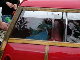 | 前を走るのは、1964年式のカントリーマン。排気量は850ccです。 | 信号待ちで、隣の塩原が窓を拭いています。 かなり雨も降っており、室内が曇っちゃうんですよね・・・。 |