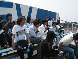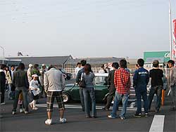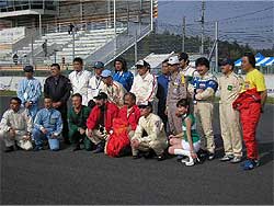 | 9:40頃、ツーリング部隊も筑波サーキットへ到着。 早速サーキット内へ入ると、丁度「おやじレース」の決勝がスタートする所です。 皆で塩原を応援。 レースの結果は・・・追い越し禁止という事で。 |