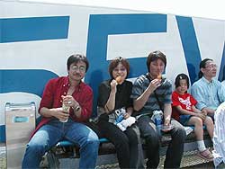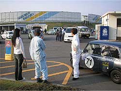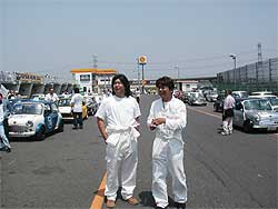 | 午前中の残りの時間は参加レースもなく、のんびりと過ごします。 耐久レースのドライバーである上島&塚越も余裕の表情。 早めに昼食を済ませ、午後に備えます。 午後は、「90分耐久レース」「サイドウェイ決勝」「スポーツ走行」と参加する種目が目白押し。 さぁ、はりきって午後へ。 |