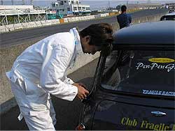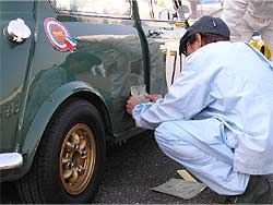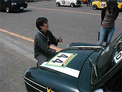 | レース部隊は、早速車輌準備に取り掛かります。 塚越はレーシングカーの準備。 レーシングカーは「おやじレース」(←本当の名称です)、そして90分耐久に参戦。 そしてもう1枚の写真は、1071クーパーS。 塩原はクーパーSで「サイドウェイ・トロフィー」というレースにも参戦です。 |