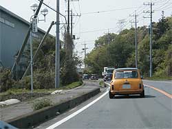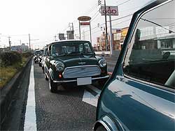 | 筑波サーキットまでは班ごとの移動となるのですが、信号待ちでミニがずらりと並ぶ事も。 周りの人や対向車も「またミニだ!」と言う感じでビックリしながら眺めています。 |