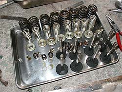 | いよいよヘッドをバラしていくのですが、ここで事件勃発です。 まずは、外したバルブ、バルブスプリング等をご覧下さい。 |