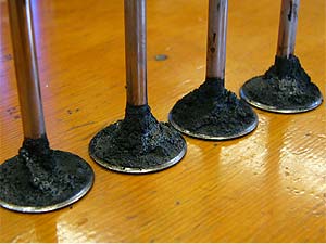 これはインテーク側のバルブです。 一目瞭然、バルブが大変な事になっています。 黒い塊は全てカーボン。 カチカチに固まっています。 まさに「浅間のいたずら鬼の押し出し」といった感じ。(群馬の人には通じると思うのですが、解らない方は「浅間のいたずら」でネットで検索してみて下さい。) もう、溶岩と言っても良いくらいでしょう。 永年、エンジンを組んできたメカニックも、「こんな酷いのは初めて見た。」という事でした。 また、バルブはかなり磨耗しており、このまま磨いても再利用は不可。 交換となりました。 |