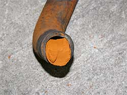続いてロアホース側です。 こちらにも同じ様に固まった錆びがギッシリと詰まっています。 これでは幾らクーラントが入っていても水が流れるスペースがありません。 |