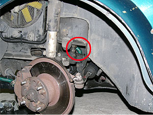 左の写真は、左フロントの足回り。 ジャッキで上げてみるとHi−Loの奥側に見慣れない物体が。 赤丸で囲んだ中に緑色の物が見えています。 |