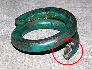 見事、赤丸の箇所からポッキリ折れています。 金属疲労で折れ、折れた部分が外れて下に落ちたのでその分、車高が下がっていたようです。 「サスペンションの可動部分にでも引っ掛かっていたら・・」と考えると怖いですね。 |