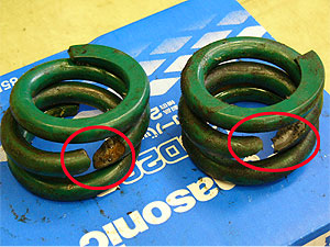 | 最終的に、フロントのHi−Loを交換し、コイルサスからラバーコーンに戻しました。 お客様はコイルを取り付けてから1年ぐらいしか経っていないとの事。 やはり、ミニの狭いスペースにコイルサスを入れるには無理があるようです。 特に、一般道を走る上では、路面のデコボコや段差などでの負担が大きく、これだけ短いコイルでは耐えられないのでしょう。 また、「乗り心地が良くなるから。」という理由で取り付ける方が多いようですが、結果、伸びる力が強く、あまり良いイメージはありません。 やはりミニにはラバーコーンでしょう。 ラバーコーンでもショックのセットアップ一つで乗り心地はとても良くなります。 また、ミニのキビキビした足回りは、ラバーコーンによってもたらされていると言っても過言ではありません。 サーキット等の一定の条件下ならまだしも、一般道でのコイルの使用はあまりお勧め出来ませんね。 コイルサスを入れようと考えている方は、使用条件等良く考えて検討するようにして下さい。 |