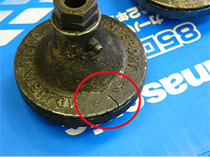 「もしかして!」と、右の足回りもチェックすると、こちらも見事に真っ二つ! 右は折れたが下に落ちず、上で辛うじて引っ掛かっていました。 しかし、ここまで見事に折れてしまうとは・・。 今までの経験上、ラバーコーンではナックルジョイント等しっかりと点検していれば考えられないトラブルです。 |