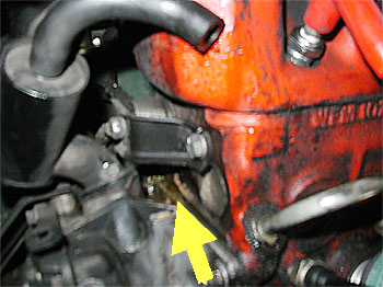 | 事の発端は、コンピュータートラブルの車をキャブ化した時に起こりました。 無事キャブ化は終了したのですが、その時にプラグからクーラント漏れを発見。 下の写真をご覧下さい。 ピントが合っていないので解りにくいと思いますが、 黄色い矢印の先にクーラント(冷却水)が漏れています。 水温が上がり内圧が上がると少しずつ出てくるようです。 |